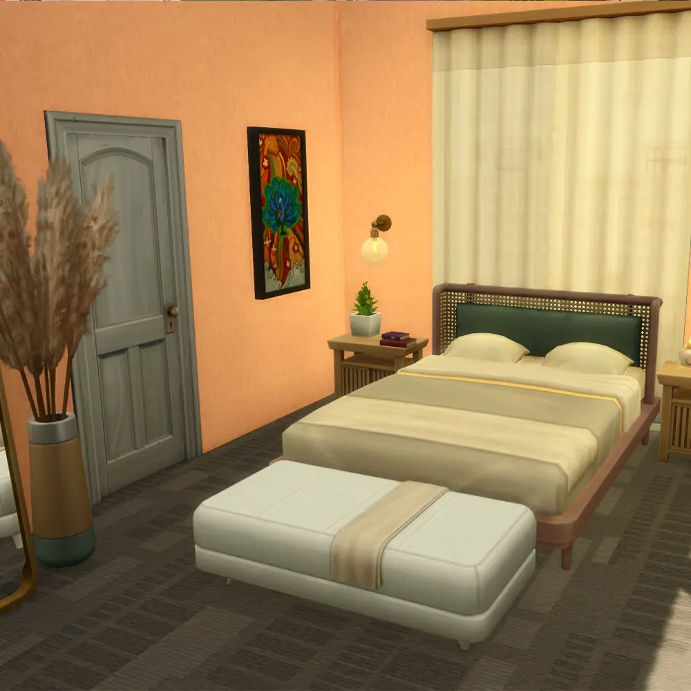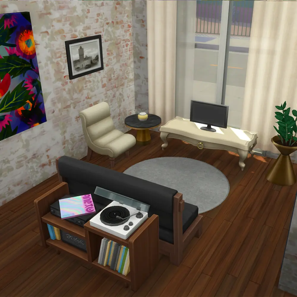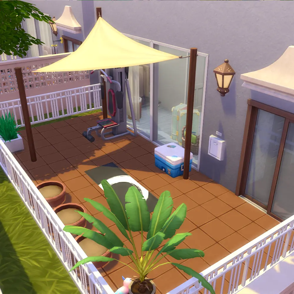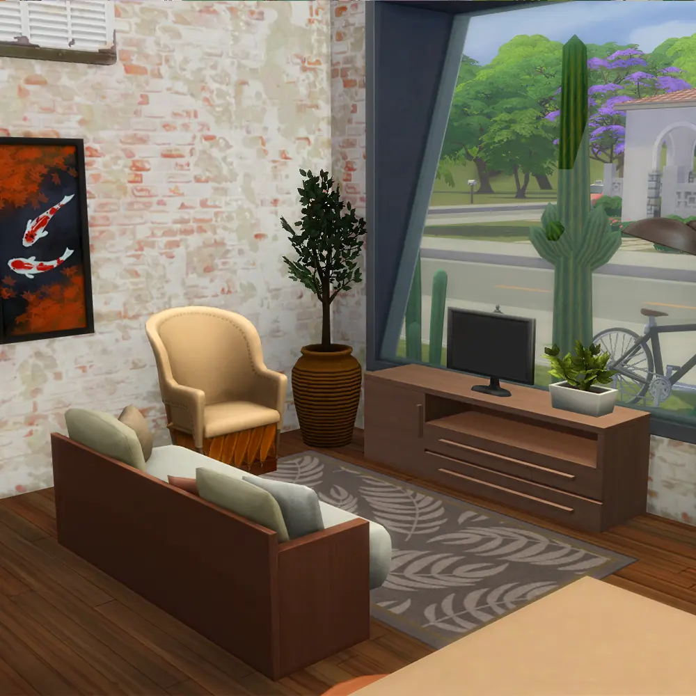 This lot is designed specifically for Ciudad Enamorada, the vibrant neighborhood introduced in The Sims 4 For Rent Expansion Pack. The warm exterior palette, palm trees, and open courtyard layout all match the city’s relaxed downtown aesthetic.