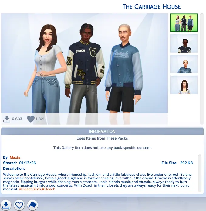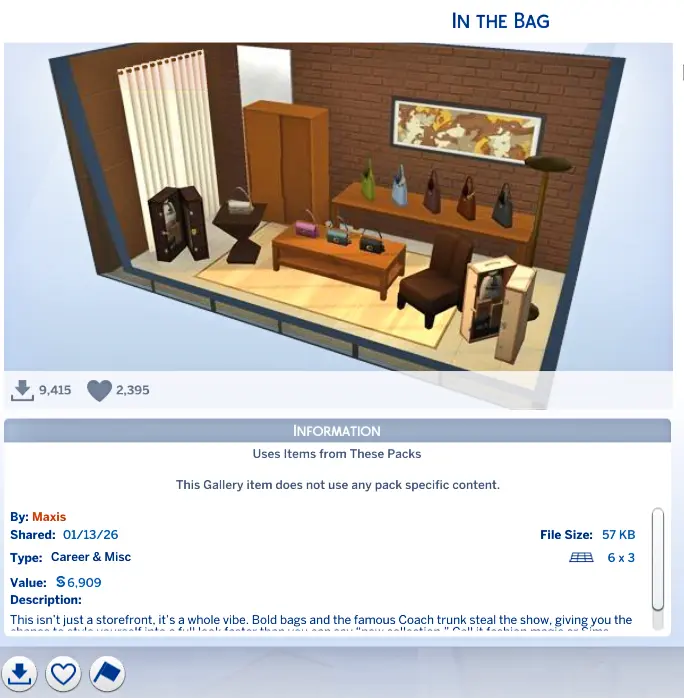 Alongside the items, the update also adds a new household to the Gallery, created to show off the new Coach looks and décor in action. There is also a themed room build designed to display the bags and trunk items in a stylish way.