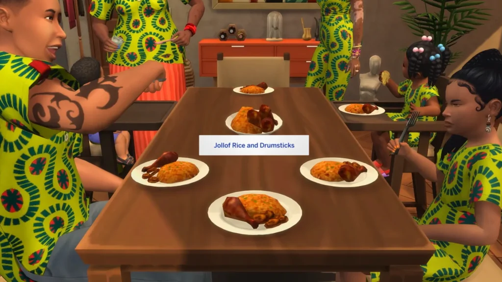 Cooking is another essential part of cultural expression. With this update, Sims can now cook Jollof Rice with Chicken Drumsticks, one of West Africa’s most beloved dishes. Found in countries like Senegal, Nigeria, and Ghana, this one-pot meal blends long-grain rice, vegetables, meat, and spices into a flavorful experience perfect for any gathering.